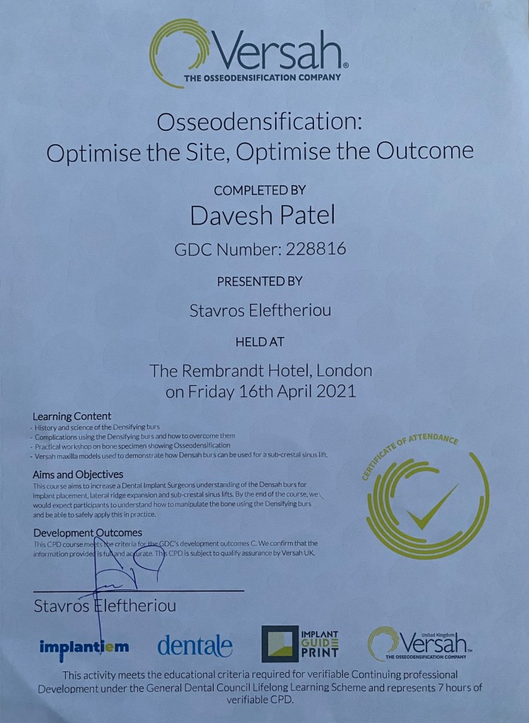 Davesh has developed a special interest in implant dentistry and has completed considerable additional training in this field including: